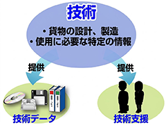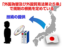 技術の提供を目的とする取引については、2009年11月1日施行の改正外為法により、2つの場合が規制されています。まず、①外為法第25条第1項(前段)に基づき、特定の種類の貨物の設計、製造若しくは使用に係る技術(以下「特定技術」という。)を特定の外国(以下「特定国」という。)において提供することを目的とする取引を行おうとする居住者若しくは非居住者は、経済産業大臣の許可(役務(えきむ)取引許可)を受ける必要があります。