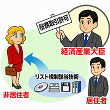 | たとえば、リスト規制に該当する技術は、国内であっても非居住者に提供する場合は役務取引許可が必要です。 |
